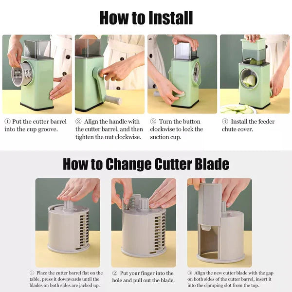 - Upgrade 3 in 1 kitchen mandolin slicer, grater, grinder, easy to operate, is ideal vegetable slicer, cheese grater, cheese slicer, cabbage slicer, potato, cucumber, carrot, onion, fruit , nuts, garlic, etc. slice, shred, grinder This rotary high-efficiency vegetable grater with handle is made of 304 stainless steel blade, the main part is made of food-grade pp material, and the bolt-type knife cylinder holder is safe and easy to replace without hurting hands. It is an indispensable good helper in kitchen gadgets。 It is stable and does not shake: and the suction cup base is enlarged to firmly attach the vegetable cutter to the smooth surface. It is not afraid of shaking when chopping vegetables for a long time. is the best seller of kitchen gadgets High quality: mandolin slicing tool, allows you to experience storm-style slicing, shredding longer and faster, and the length can reach 10cm, which can meet the needs of various lengths. Whether it is shredded or sliced, the effect of cutting is uniform and complete. Make your cooking more efficient and beautiful Safe Hand Protection: Upgraded Food Slicer Eliminates the Need to Grip Food . Enlarge the caliber to accommodate larger food slices, which can be directly put in without cutting into small pieces. Slicing, shredding, and sanding can be done easily by pressing the top cover.